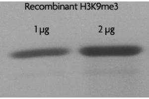 - Recombinant Histone H3 trimethyl Lys9 (H3K9me3) proteins are generated using expressed protein ligation (EPL) technology. Truncated human Histone H3.2 is produced in E. coli and purified using FPLC. The purified protein is subsequently ligated to a N-terminal histone tail peptide containing trimethyl lysine 9 via a native peptide bond. The full-length protein is then repurified prior to lyophilization. Protein concentration was determined using the molar extinction coefficient for Histone H3 and absorbance at 280nm. The recombinant histone is >98 % pure by SDS-PAGE and confirmed by high-resolution ESI-TOF mass spectrometry. The molecular weight of the recombinant histone is 15,268 Daltons.
