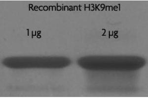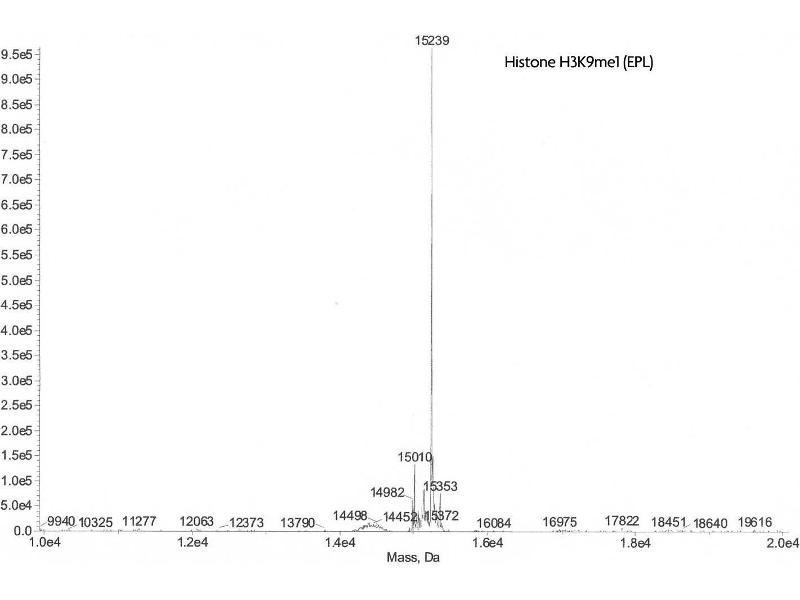 - Recombinant Histone H3 monomethyl Lys9 (H3K9me1) proteins are generated using expressed protein ligation (EPL) technology. Truncated human Histone H3.2 is produced in E. coli and purified using FPLC. The purified protein is subsequently ligated to a N-terminal histone tail peptide containing monomethyl lysine 9 via a native peptide bond. The full-length protein is then repurified prior to lyophilization. Protein concentration was determined using the molar extinction coefficient for Histone H3 and absorbance at 280nm. The recombinant histone is >98 % pure by SDS-PAGE and confirmed by high-resolution ESI-TOF mass spectrometry. The molecular weight of the recombinant histone is 15,239 Daltons.