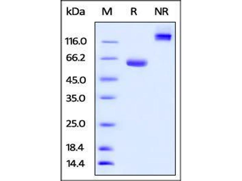 - This protein carries a human IgG1 Fc tag at the C-terminus. The protein has a calculated MW of 50.6 kDa. As a result of glycosylation, the protein migrates as 55-66 kDa under reducing (R) condition, and 116-130 kDa under non-reducing (NR) condition (SDS-PAGE).