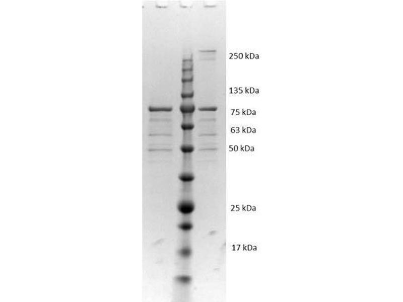 Application Note: VlsE is suitable as a control in immunological assays. Specific conditions for reactivity should be optimized by the end user. Expect a band at 78.7 kDa for VlsE-MBP, (36.3 kDa for VlsE and 42.4 kDa for MBP) in size corresponding to VlsE by Western blotting in the appropriate cell lysate or extract. Variable Lipoprotein Surface-Exposed protein was tested in SDS-page and western blot.
