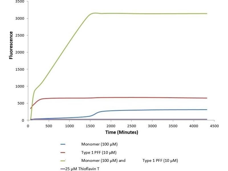 - Endogenous alpha-synuclein phosphorylation. 100 μM alpha synuclein protein monomer (SPR-323) seeded with 10 nM alpha synuclein protein PFF (SPR-324) in 25 μM Thioflavin T (PBS pH 7.4, 100 μl reaction volume) generated an increased fluorescence intensity after incubation at 37°C with shaking at 600 rpm for 24 hours. Fluorescence was measured by excitation at 450 nm and emission at 485 nm on a Molecular Devices Gemini XPS microplate reader.