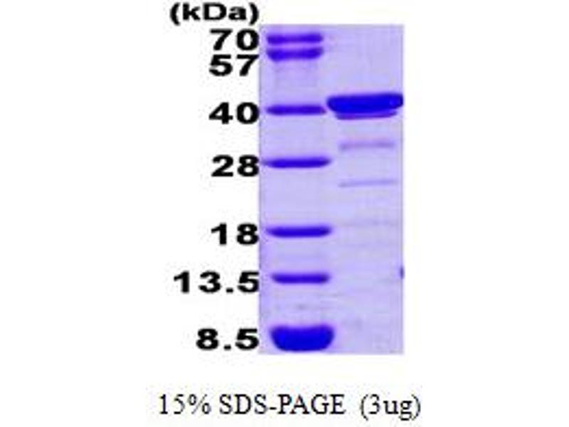 - 33.3 kDa (295aa) confirmed by MALDI-TOF (Molecular weight on SDS-PAGE will appear higher)