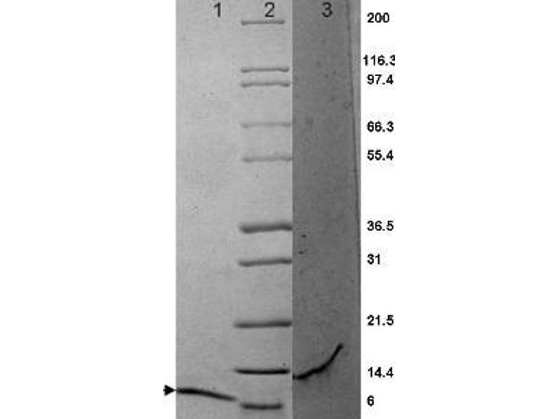 Application Note: MIP-3α protein has been tested by SDS-PAGE and is suitable as a control for polyclonal or monoclonal anti-MIP-3α in immunological assays.