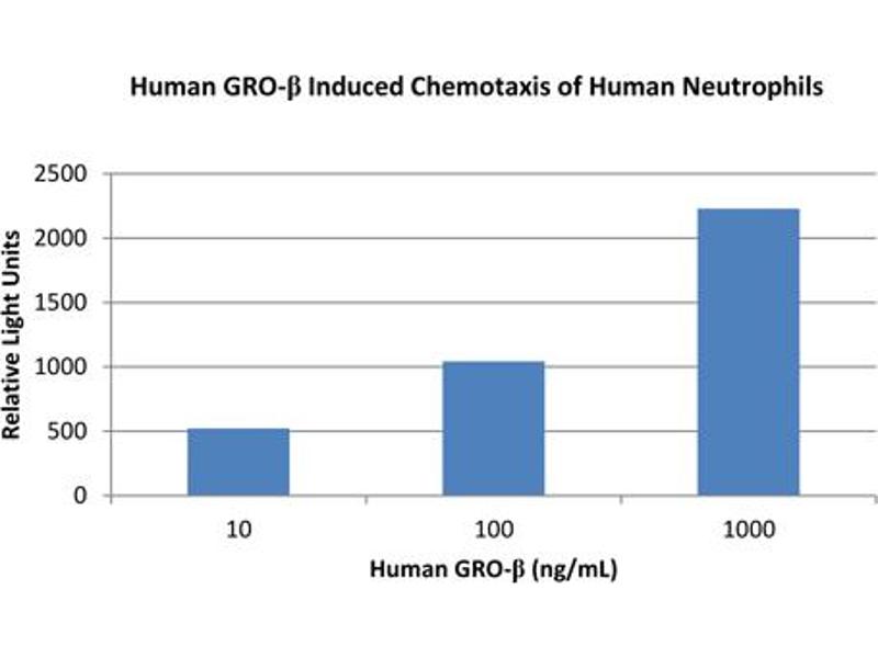 Background: Three human MGSA/GRO genes encode 3 highly related chemokines, MGSA/GRO α, -β and -g. All 3 MGSA/GRO proteins bind to the same receptors, but with differing affinities, and stimulate a number of biological responses including chemotaxis, angiogenesis, and growth regulation. Recombinant human GROβ is a non-glycosylated protein, containing 73 amino acids, with a molecular weight of 7.9 kDa.