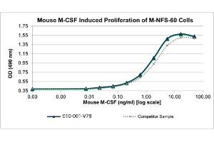 Background: Macrophage Colony Stimulating Factor (M-CSF) is hematopoietic growth factor produced by a wide variety of cells. M-CSF is known to stimulate differentiation of hematopoietic stem cells to monocyte-macrophage cell populations in culture. M-CSF acts through the CSF receptor 1. Although human M-CSF shows activity on mouse cells, mouse CSF shows no activity on human cells. Recombinant mouse M-CSF is a disulfide-linked homodimer, containing two 156 amino acid chains, with a total molecular weight of 36.8 kDa.