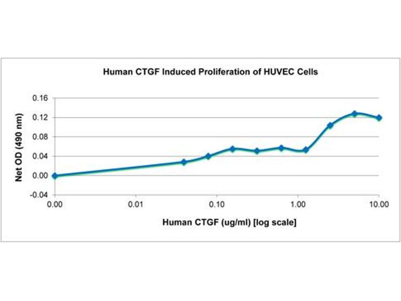 Background: Connective Tissue Growth Factor (CTGF) is a member of cysteine rich regulatory proteins that are both mitogenic and chemotactic. Each protein has an Insulin-like Growth Factor (IGF)-binding domain, a thrombospondin type 1 domain and cysteine knot region. CTGF has multiple effects on development and differentiation. Recombinant human CTGF is a non-glycosylated protein, containing 98 amino acids, with a molecular weight of 11.2 kDa.