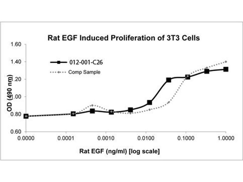 Background: Epidermal Growth Factor (EGF) is a growth factor that stimulates the proliferation of epithelial and epidermal cells. EGF family members are characterized by three intramolecular disulfide bonds and can bind to four different receptor tyrosine kinases known as EGFR/ErbB1, ErbB2, ErbB3, and ErbB4. Recombinant rat EGF is a non-glycosylated protein, containing 54 amino acids, with a molecular weight of 6.3 kDa.