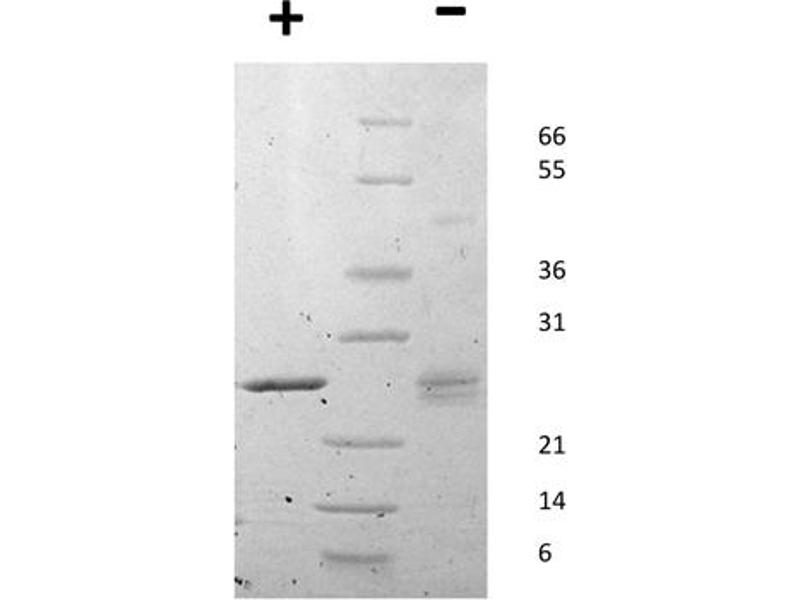 Epstein-Barr Virus Induced Gene 3 purity was determined to be greater than 90% as determined by analysis by UV-Spectroscopy at 280nm and by reducing and non-reducing SDS-pAGE.