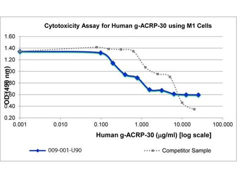 Application Note: Human globular ACRP-30 Recombinant Protein has been tested by SDS-PAGE and biological activity and is suitable as a control for polyclonal or monoclonal anti-Human globular ACRP-30 in immunological assays. Lyophilized in 10 mM sodium phosphate, 0.75 mM DTT, pH 8.0.