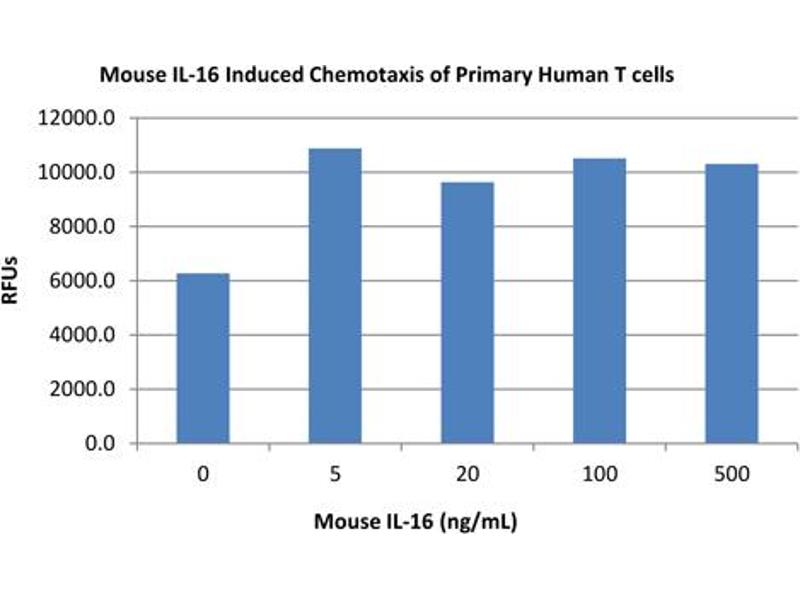Background: Interleukin 16 (IL-16) is produced primarily by CD4+ and CD8+ T cells and acts as a chemo-attractant for lymphocytes, monocytes, eosinophils, dendritic cells and Langerhans cells. Additionally, IL-16 has been reported to upregulate IL-2 receptor (CD25), induce progression of cells to the G1 phase and suppress HIV & SIV replication. Recombinant mouse IL-16 is a non-glycosylated protein, containing 127 amino acids, with a molecular weight of 13.2 kDa.