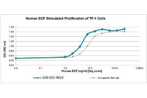 Background: Stem Cell Factor (SCF) is a cytokine made by fibroblasts and endothelial cells. SCF binds to the receptor known as c-Kit (CD117) and is thought to play a critical role in the maintenance or survival of hematopoietic stem cells. Human SCF shows no activity on murine cells, but murine and rat SCF are active on human cells. Recombinant human SCF is a non-glycosylated protein, containing 165 amino acids, with a molecular weight of 18.4 kDa