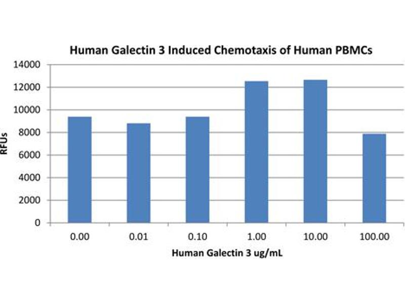 Background: Galectin-3 belongs to a large family of carbohydrate-binding proteins called lectins. Galectin-3 is expressed by a wide range of cell types including activated T cells, tumor cells, macrophages, osteoclasts, fibroblasts and epithelial cells and interacts with β-galactoside sugar moieties. Galectin-3 is associated with cancer, heart failure, stroke and inflammation. Human and mouse Galectin-3 share an 80 % homology by amino acid sequence. Recombinant human Galectin-3 is a non-glycosylated protein, containing 250 amino acids, with a molecular weight of 26 kDa.