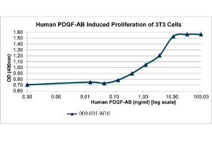 Background: Platelet-Derived Growth Factor (PDGF) is a mitogenic peptide growth hormone carried in the alpha-granules of platelets and is released when platelets adhere to traumatized tissues. Connective tissue cells near the traumatized region respond by initiating the process of replication. The synthesis of PDGF can be induced by IL-1, IL-6, TNF-α, TGF-β and EGF. Recombinant human PDGF-AB is a non-glycosylated, disulfide-linked heterodimer, containing one 14.3 kDa alpha-chain and one 12.1 kDa beta-chain, with total molecular weight of 26.4 kDa.
