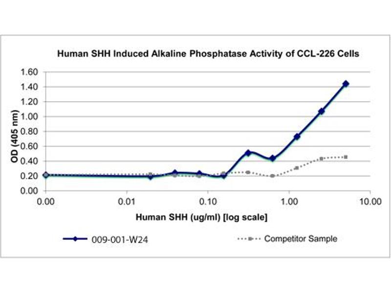 Background: Sonic hedgehog (SHH) is a member of a small group of secreted proteins that are essential for development in both vertebrates and invertebrates. Three mammalian hedgehog genes (sonic, desert, Indian) share about 60 % homology and all signal via the same receptors. Recombinant human SHH is a non-glycosylated protein, containing 175 amino acids, with a molecular weight of 19.7 kDa. The Cys at position 25 has been substituted with Ile.