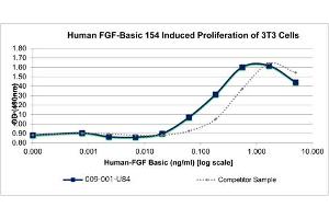 Background: Fibroblast Growth Factors (FGFs) are a 22 member family of proteins known to be involved in angiogenesis, wound healing and embryonic development. As a family, they bind to heparin and signal through four receptor tyrosine kinases called, FGFR1, 2, 3 and 4. Although the mechanism remains unclear, FGF-basic 154, also known as FGF-2, is a critical component in keeping embryonic stem cells undifferentiated in cell culture systems. Recombinant human FGF-b 154 (FGF-2) is a non-glycosylated protein, containing 154 amino acids, with a molecular weight of 17.2 kDa.