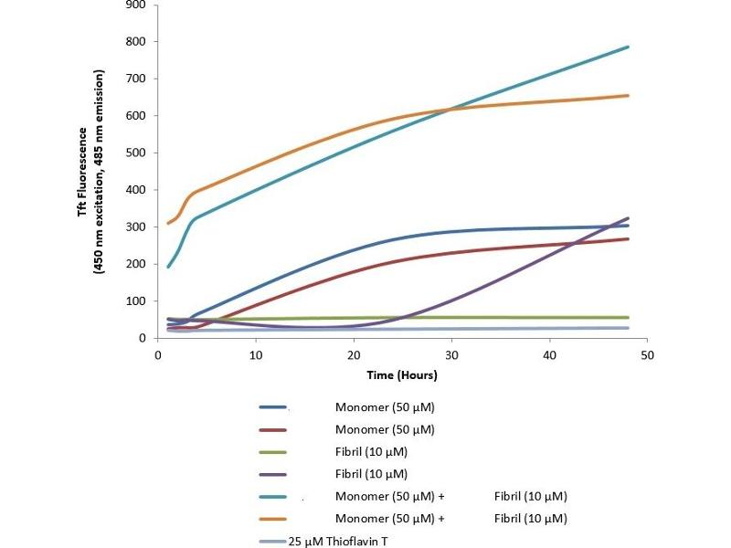 - Thioflavin T emission curve shows increased fluorescence (correlated to tau protein fibrillation) when active tau PFFs are combined with active tau monomers.