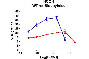 - Hemofiltrate CC chemokine-1(HCC-1/CCL14) is endogeneously expressed by numerous tissues. Upon processing of the N terminal residues of the full length HCC-1 by the uPA-plasmin system, the active form of HCC-1 (made by ChemoTactics) is a strong agonist for CCR1, CCR5 and to a lesser extent CCR3, and causes chemotaxis of different types of leukocytes. The active form of HCC-1 is also shown as a potent inhibitor of HIV entry.