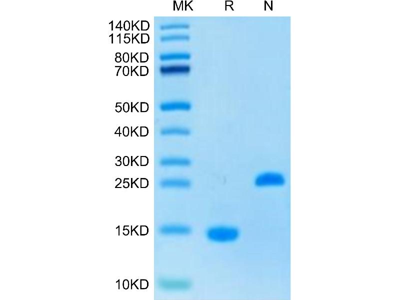 - 12.97 kDa. Due to glycosylation, the protein migrates to 14-15 kDa under reduced (R) condition, and 23-25 kDa under Non reducing (N) condition based on Tris-Bis PAGE result.