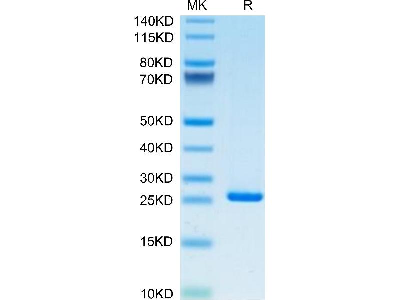 - 24.14 kDa. Due to glycosylation, the protein migrates to 25-27 kDa based on Tris-Bis PAGE result.