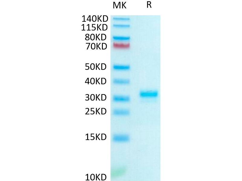- 25.5 kDa. Due to glycosylation, the protein migrates to 31-33 kDa based on Bis-Tris PAGE result.
