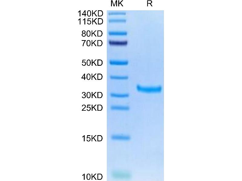 - 26.38 kDa. Due to glycosylation, the protein migrates to 33-38 kDa based on Bis-Tris PAGE result.