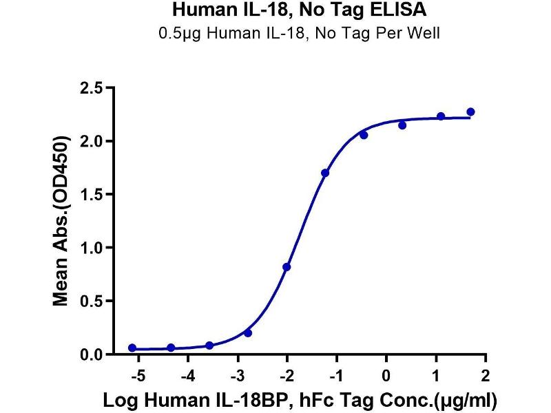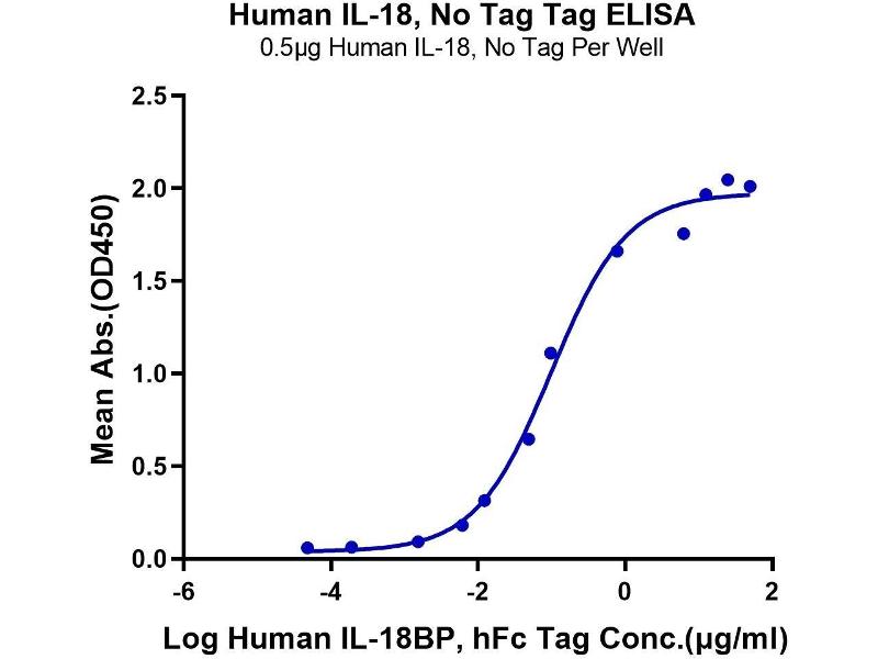 - Immobilized Human IL-18 at 5μg/ml (100μl/Well) on the plate. Dose response curve for Human IL-18BP, hFc Tag with the EC50 of 18.2ng/ml determined by ELISA. The affinity constant of 1.21nM as determined in SPR assay (Biacore T200). See testing image for detail.