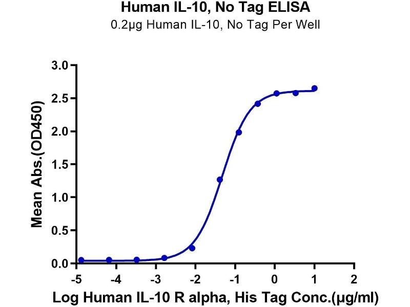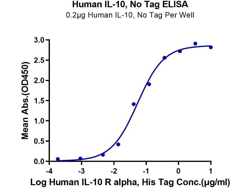 - Immobilized Human IL-10, No Tag at 2μg/ml (100μl/well) on the plate. Dose response curve for Human IL-10 R alpha, His Tag with the EC50 of 47.4ng/ml determined by ELISA. The affinity constant of 0.255 nM as determined in SPR assay (Biacore T200). See testing image for detail.