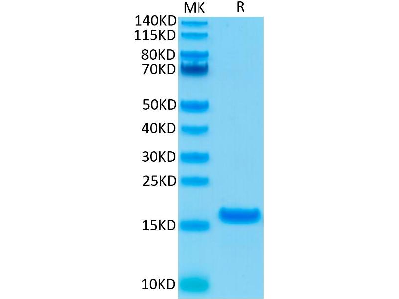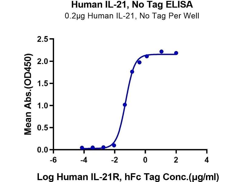 - Immobilized Human IL-21, No Tag at 2ug/ml (100ul/well) on the plate. Dose response curve for Human IL-21R, hFc Tag with the EC50 of 42.3ng/ml determined by ELISA.,Human IL-21 on Bis-Tris PAGE under reduced condition. The purity is greater than 95%.,Measured by its ability to enhance IFN-gamma secretion in NK-92 human natural killer lymphoma cells. The ED50-for this effect is <8 ng/mL (QC Test).,The purity of Human IL-21 is greater than 95% as determined by SEC-HPLC.