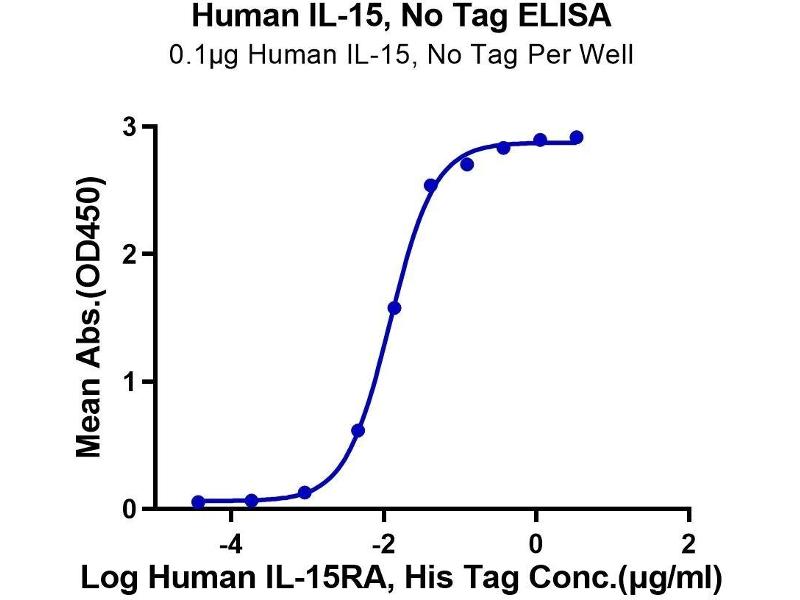 - Human IL-2 R beta, His Tag captured on CM5 Chip via Anti-His Antibody can bind Human IL-15, No Tag with an affinity constant of 5.9 nM as determined in SPR assay (Biacore T200).,Immobilized Human IL-15, No Tag at 2 ug/ml (100 ul/Well) on the plate. Dose response curve for Human IL-15RA, His Tag with the EC50 of 15.4 ng/ml determined by ELISA.,Human IL-15 on Bis-Tris PAGE under reduced condition. The purity is greater than 95%.,Measured in a cell proliferation assay using CTLL-2 cells. The ED50-for this effect is 0.1 - 0.3 ng/mL. The specific activity of recombinant human IL-15 is > 1 x 10^7-units/mg, which is calibrated against the human IL-15 reference standard (NIBSC code: 95/554) (QC Test).,The purity of Human IL-15 is greater than 95% as determined by SEC-HPLC.