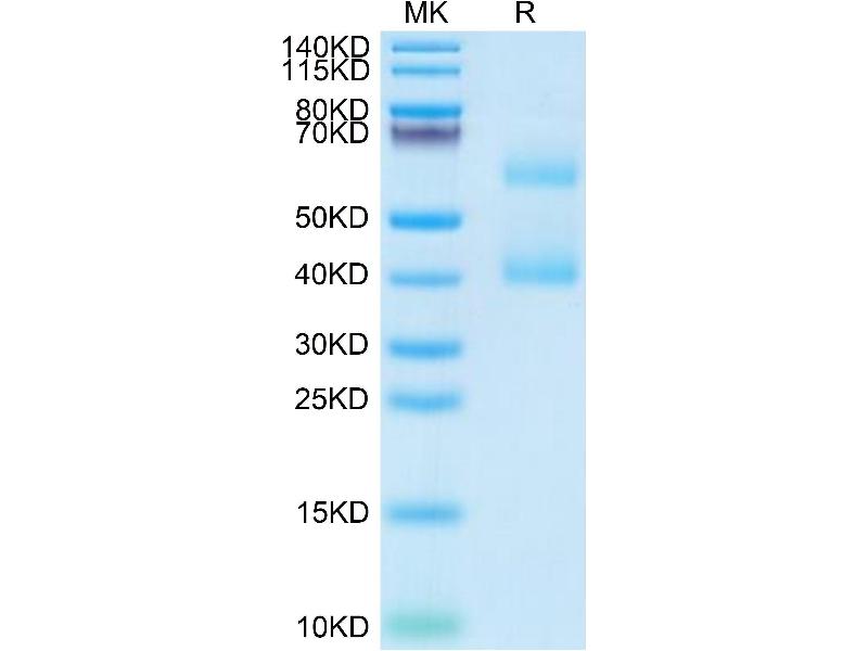 - 45.3 kDa. The protein is cleaved into 2 chains and due to glycosylation, it migrates to 45-60 kDa based on Tris-Bis PAGE result.