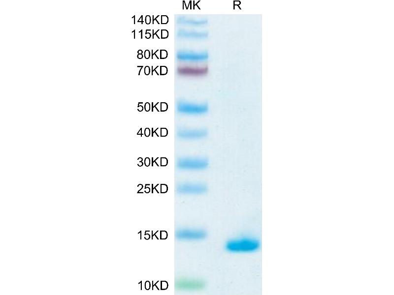 - 13.2 kDa (monomer). Due to glycosylation, the protein migrates to 14-15 kDa (monomer) under reduced (R) condition and 26-30 kDa (dimer) under Non reducing (N) condition based on Tris-Bis PAGE result.