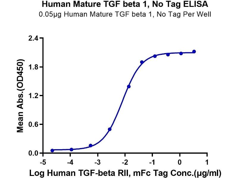 - Immobilized Human Mature TGF beta 1, No Tag at 0.5μg/ml (100μl/well) on the plate. Dose response curve for Human TGF-beta RII, mFc Tag with the EC50 of 8ng/ml determined by ELISA. See testing image for detail.