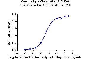 - Immobilized Cynomolgus Claudin 6 VLP at 5μg/ml (100μl/Well) on the plate. Dose response curve for Anti-Claudin6 Antibody, mFc Tag with the EC50 of 4ng/ml determined by ELISA (QC Test). The affinity constant of 0.85 nM as determined in SPR assay (Biacore T200).