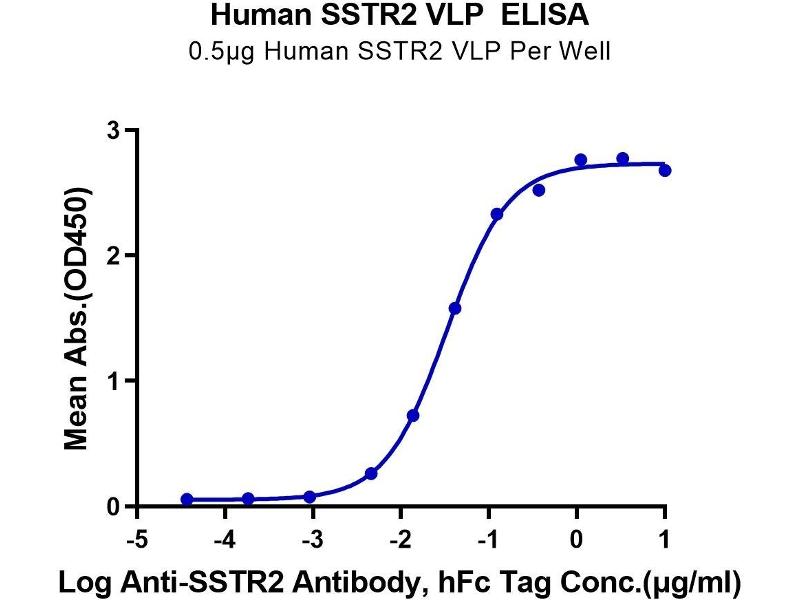 - Immobilized Human SSTR2 VLP at 5ug/ml on the plate (100ul/Well). Dose response curve for Anti-SSTR2 Antibody, hFc Tag with the EC50 of 19.1ng/ml determined by ELISA.,The purity of Human SSTR2 VLP is greater than 95% as determined by SEC-HPLC.