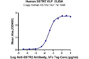 - Immobilized Human SSTR2 VLP at 5μg/ml on the plate (100μl/Well). Dose response curve for Anti-SSTR2 Antibody, hFc Tag with the EC50 of 32.8ng/ml determined by ELISA.