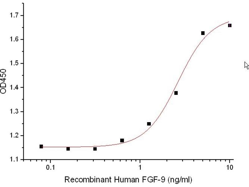 Fibroblast Growth Factor 9 (FGF-9) belongs to the Fibroblast growth factor (FGF) family. FGF family members possess broad mitogenic and cell survival activities, and are involved in a variety of biological processes, including embryonic development, cell growth, morphogenesis, tissue repair, tumor growth and invasion. FGF-9 plays an important role in the regulation of embryonic development, cell proliferation, cell differentiation and cell migration. In addition, FGF-9 may have a role in glial cell growth and differentiation during development, gliosis during repair and regeneration of brain tissue after damage, differentiation and survival of neuronal cells, and growth stimulation of glial tumors. -