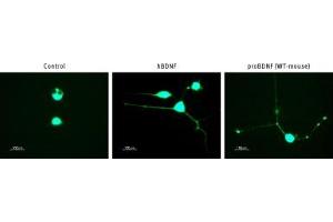 - ProBrain-Derived Neurotrophic Factor,BDNF is a neurotrophic factor produced by proteolytic cleavage of its precursor, proBDNF. The biologically relevant form of the protein was thought to be the mature form, BDNF, which has been shown to affect the development of motoneurons, modulate synaptic transmission and affect axonal branching, dendrite growth and synapse number.1 These actions are mediated via the binding of BDNF to TrkB. Different actions are mediated by the binding of BDNF to p75 such as neuronal process retraction2 and neuronal apoptosis.3 The precursor form was thought to be important for the correct folding, secretion and trafficking of the mature protein. A single-nucleotide polymorphism (Val66 to Met) in the pro-domain of the human BDNF gene impairs intracellular trafficking and regulated secretion of BDNF in primary cortical neurons and neurosecretory cells but not in endothelial and vascular cells.4 This has been shown to affect memory and lead to abnormal hippocampal function in humans.5The finding that proBDNF and not mature BDNF is the preferred ligand for p756 has ushered in a new era which reexamines the biological roles of the two forms. Contradictory biological roles for proBDNF have been proposed. It has been shown to be a pro-apoptotic ligand for sympathetic neurons7 expressing both p75 and sortlin, and to be involved in LTD8. On the other hand it has also been shown to elicit prototypical TrkB responses in biological assays, such as TrkB tyrosine phosphorylation, and activation of ERK1/2.9 Binding of both proBDNF and mature BDNF to TrkB has been proposed to be via the R103 residue in the mature portion.9 In addition, the question of the relative abundance of the precursor vs the mature form has been investigated. In brain homogenates a mixture of proBDNF and mature BDNF has been found.10,11 The secretion of proBDNF from cortical neurons has been shown.7 Most of the work showing secretion of proBDNF was done in cell lines overexpressing full length BDNF constructs.4, 6, 12, 13 It has been argued14 that this model misrepresents the authentic situation in vivo, since in the transfected systems the secretion of proBDNF results from overloading the limited capacity of the processing machinery. These authors argue that in fact proBDNF is a transient intermediate and is rapidly converted intracellularly to mature BDNF.