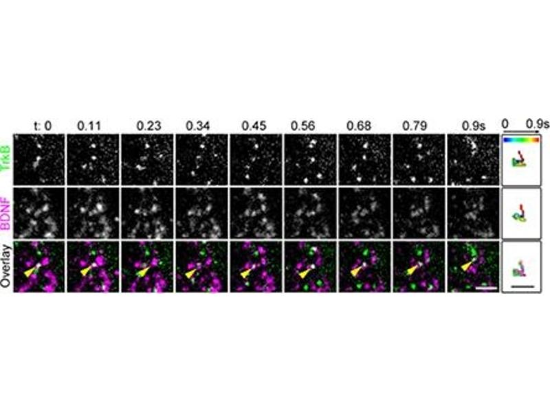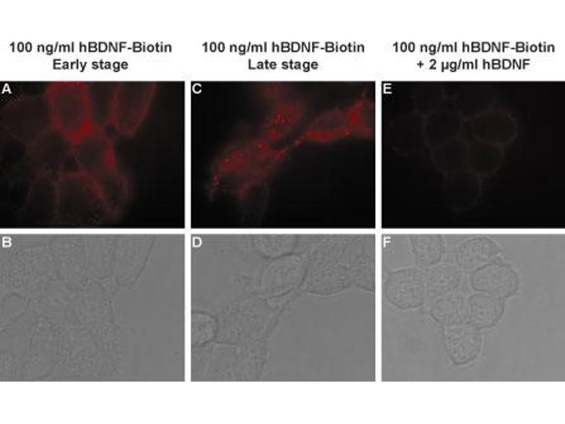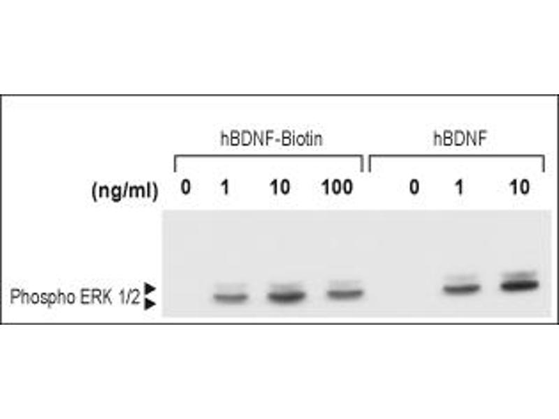 - Brain-Derived Neurotrophic Factor,Few examples in the literature emphasize the importance of using BDNF-biotin in living cells experiments. Pardridge, W.M et al. demonstrated that the delivery of BDNF to the brain is non-existent owing to the combined effects of neglible blood brain barrier (BBB) transport and rapid systemic clearance1. The brain delivery of BDNF may be increased by conjugating biotinylated BDNF to BBB drug delivery vectors, such as neutral avidin conjugated to murine monoclonal antibody to the rat transferrin receptor1. Zhang, Y. and Pardridge, W.M further showed that when BDNF is formulated to enable transport across the BBB, the intravenous administration of BDNF results in the reduction in stroke volume and improvement in functional outcome2.Du, J. et al. detected by using BDNF-biotin the ligand-induced TrkB internalization in cultured hippocampal neurons3.Bhattacharyya, A. et al. showed in mature sciatic nerves, that biotinylated BDNF activated Trk receptors function as rapid retrograde signal carriers to execute remote responses to target-derived neurotrophins4.Song, X.Y. et al. proved that exogenous BDNF-biotin is transported by the peripheral nerves following injection into the rat footpad and can be found in the sciatic nerves in fibres and vesicles5. Their data suggest that peripherally applied BDNF may have therapeutic effects on injured spinal cord. Xie, W. et al. followed the trafficking of QD-BDNF (Quantum Dot-BDNF) after its internalization at the axon terminal6. Their result showed that QD-BDNF could be used to track the movement of exogenous BDNF in neurons over long distances and to study the signaling organelles that contain BDNF6.
