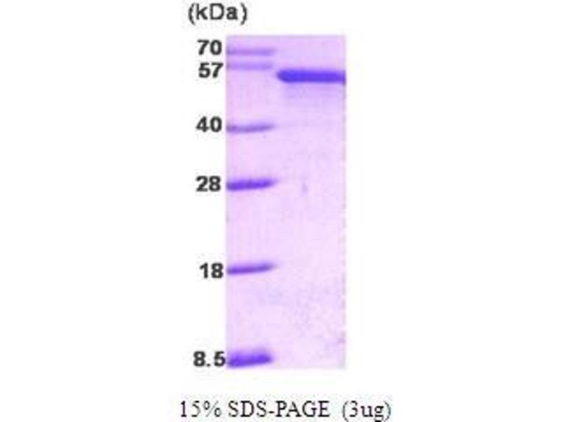 PDCD4 (Programmed cell death 4) encodes a tumor suppressor protein whose expression is lost in progressed carcinomas of lung, breast, colon, and prostate. The expression of PDCD4 gene is strongly induced during apoptosis in a number of cell types. It is modulated by cytokines in natural killer and T cells. Recombinant human PDCD4, was expressed in E. coli and purified by conventional chromatography techniques.