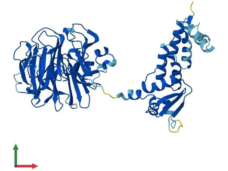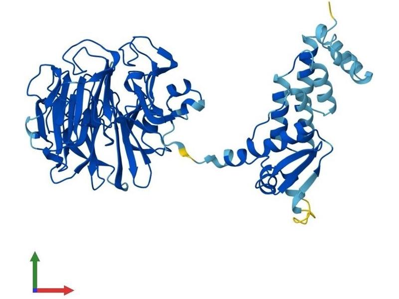 This gene encodes a protein with an N-terminal RCC1 domain and a C-terminal BTB (broad complex, tramtrack and bric-a-brac) domain. In rat, over-expression of this gene in vascular smooth muscle cells induced cellular hypertrophy. In rat, the C-terminus of RCBTB1 interacts with the angiotensin II receptor-1A. In humans, this gene maps to a region of chromosome 13q that is frequently deleted in B-cell chronic lymphocytic leukemia and other lymphoid malignancies. [provided by RefSeq, Jul 2008].