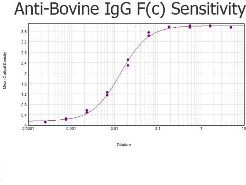 Application Note: Anti-Bovine IgG F(c) Antibody has been tested by ELISA and is suitable for immunoblotting (western or dot blot), ELISA, and immunohistochemistry requiring extremely low background levels, lot-to-lot consistency, high titer and specificity. Immunohistochemistry Dilution: 1:1,000 - 1:5,000 Western Blot Dilution: 1:2,000 - 1:10,000 ELISA Dilution: 1:20,000 - 1:100,000 Other: User Optimized