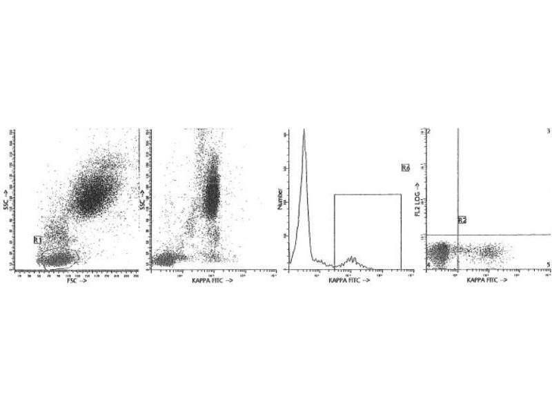 Kappa light chains of human immunoglobulins occur in 50-70 % of normal human B lymphocytes while lambda light chains are expressed in 30-50 % of these cells. Abnormal expression of kappa and lambda light chains occur in leukemia. Anti-kappa and anti-lambda antibodies are frequently used in combination with CD19 or CD138 for the detection of light chains of surface immunoglobulin on normal and neoplastic B cells.