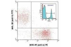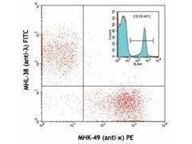 The MHK-49 antibody reacts with both soluble and membrane human immunoglobulin light chain kappa (κ). It does not react with human immunoglobulin light chain lambda (λ) or heavy chain (μ). The MHK-49 antibody can be used as primary or secondary reagent for immunofluorescent staining or ELISA analysis.