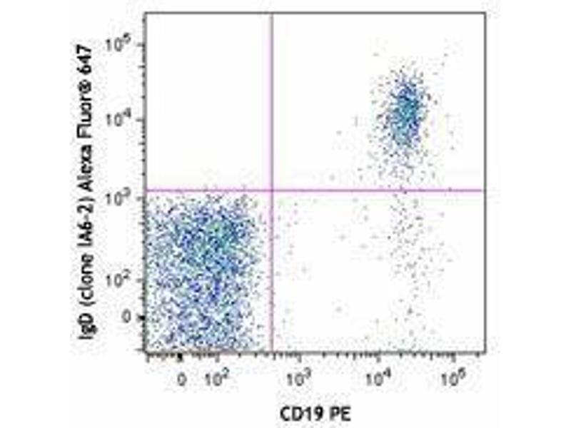 IgD, a member of the immunoglobulin (Ig) family, is expressed in naive B cells. It has 3 Ig-like domains and exists in a transmembrane and a soluble form. In general, IgD is not secreted and usually its expression is lost after the Ig isotype switch. After antigen binding, IgD signals through the CD79a/CD79b (Igα/Igβ) heterodimer, resulting in the activation of the B cell.