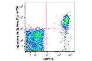 IgD, a member of the immunoglobulin (Ig) family, is expressed in naive B cells. It has 3 Ig-like domains and exists in a transmembrane and a soluble form. In general, IgD is not secreted and usually its expression is lost after the Ig isotype switch. After antigen binding, IgD signals through the CD79a/CD79b (Igα/Igβ) heterodimer, resulting in the activation of the B cell.