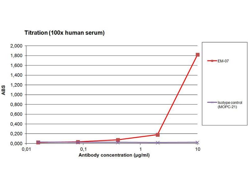 Western blotting and ELISA: The peroxidase conjugate of this antibody is suitable for detection of human IgG Fc fragments. The antibody EM-07 does not crossreact with IgM.