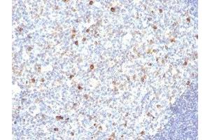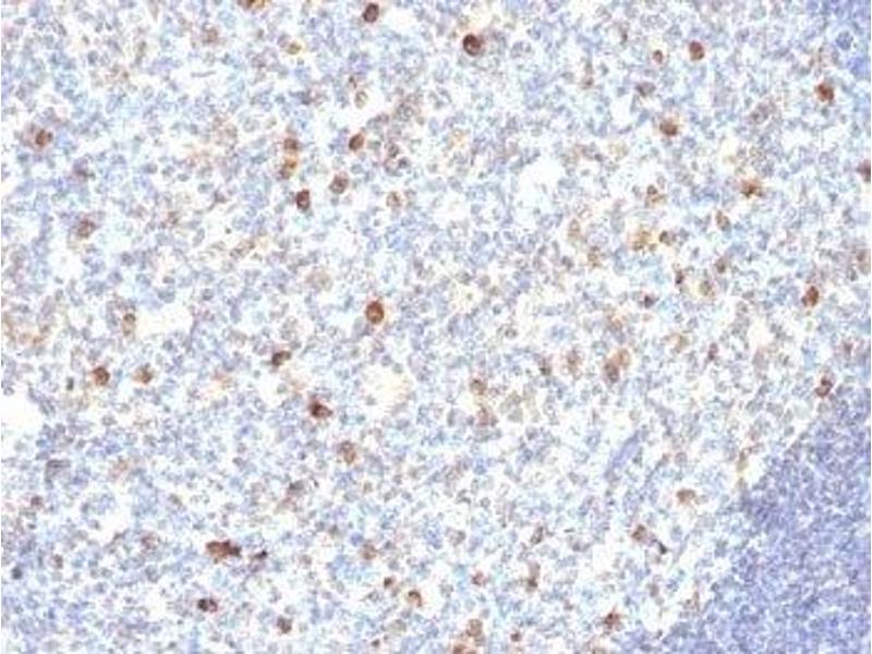 - Recognizes a protein of 75 kDa, identified as mu heavy chain of human immunoglobulins. It does not cross-react with alpha (IgA), gamma (IgG), epsilon (IgE), or delta (IgD), heavy chains, T-cells, monocytes, granulocytes, or erythrocytes. Monomeric IgM is expressed as a membrane bound antibody on the surface of B cells and as a pentamer when secreted by plasma cells. IgM antibody is prominent in early immune responses to most antigens. Aberrant levels are associated with immune deficiency states, hereditary deficiencies, myeloma, Waldenstrom's macroglobulinemia, chronic infection and hepatocellular disease. This mAb is useful in the identification of leukemias, plasmacytomas, and certain non-Hodgkins lymphomas. The most common feature of these malignancies is the restricted expression of a single heavy chain class. Demonstration of clonality in lymphoid infiltrates indicates that the infiltrate is clonal and therefore malignant.