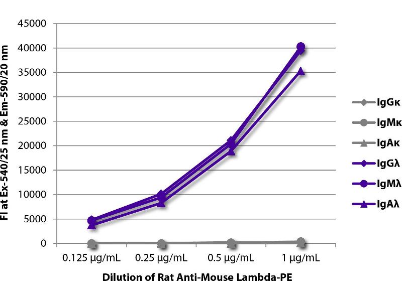 Working Dilutions: Flow Cytometry FITC and BIOT conjugates 1 g/106 cells PE conjugate 0.2 g/106 cells For flow cytometry, the suggested use of these reagents is in a final volume of 100 L ELISA AP conjugate 1:1,000 - 1:4,000 HRP conjugate 1:4,000 - 1:8,000 BIOT conjugate 1:5,000 - 1:10,000 FLISA FITC conjugate 1:200 - 1:400 PE conjugate 1 g/mL