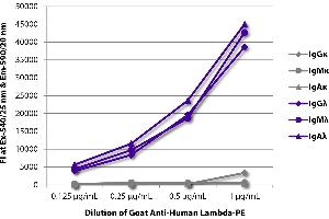 Working Dilutions: ELISA AP conjugate 1:2,000 - 1:4,000 HRP conjugate 1:4,000 - 1:8,000 BIOT conjugate 1:5,000 - 1:20,000 FLISA FITC, TRITC, TXRD, AF488, and AF555 conjugates 1:100 - 1:400 PE and AF647 conjugates 1 g/mL Flow Cytometry FITC, AF488, and BIOT conjugates 1 g/106 cells PE and AF647 conjugates 0.1 g/106 cells For flow cytometry, the suggested use of these reagents is in a final volume of 100 L