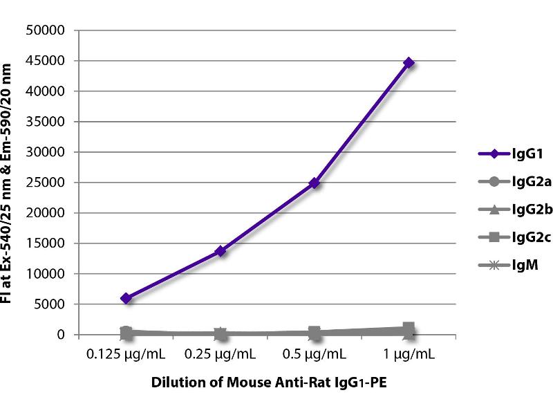 Working Dilutions: Flow Cytometry FITC, BIOT, and AF488 conjugates 1 g/106 cells PE, CY5, and AF647 conjugates 0.1 g/106 cells For flow cytometry, the suggested use of these reagents is in a final volume of 100 L ELISA AP conjugate 1:1,000 - 1:4,000 HRP conjugate 1:4,000 - 1:8,000 BIOT conjugate 1:5,000 - 1:10,000 FLISA FITC and AF488 conjugates 1:200 - 1:400 AF555 conjugate 1:100 - 1:400 PE, CY5, and AF647 conjugates 1 g/mL
